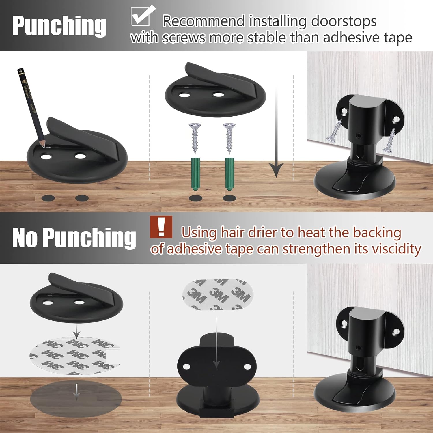 3- Secure with Screws: Insert the screws through the base of the door stopper into the drilled holes to secure it firmly in place.