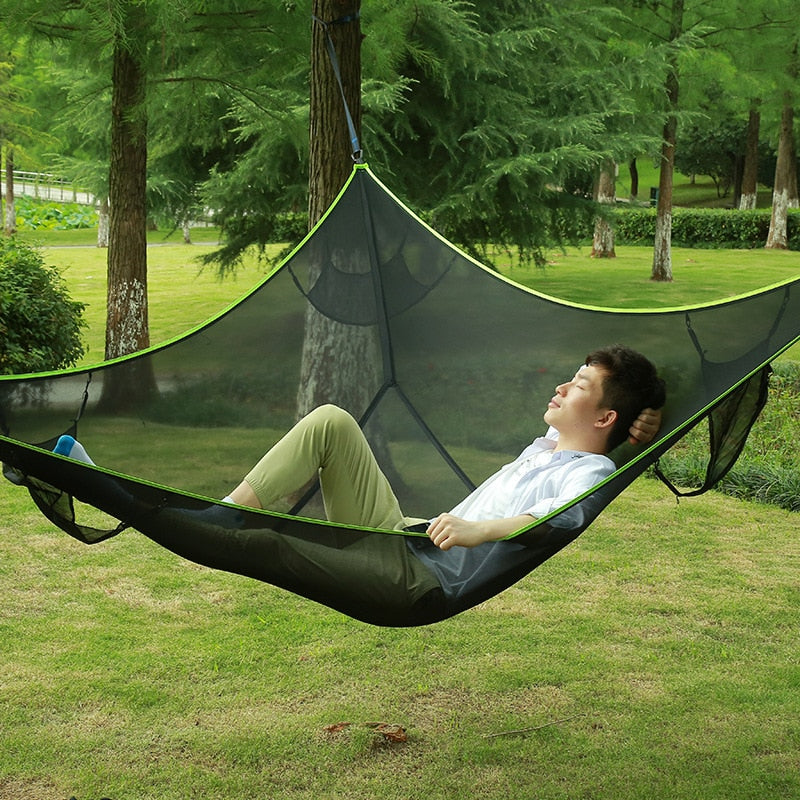 Durability - The hammock is equipped with reinforced webbing and double-layered stitching that won't easily tear. Additionally, the mesh hammock is breathable and made from weather-resistant materials to withstand all weather conditions.