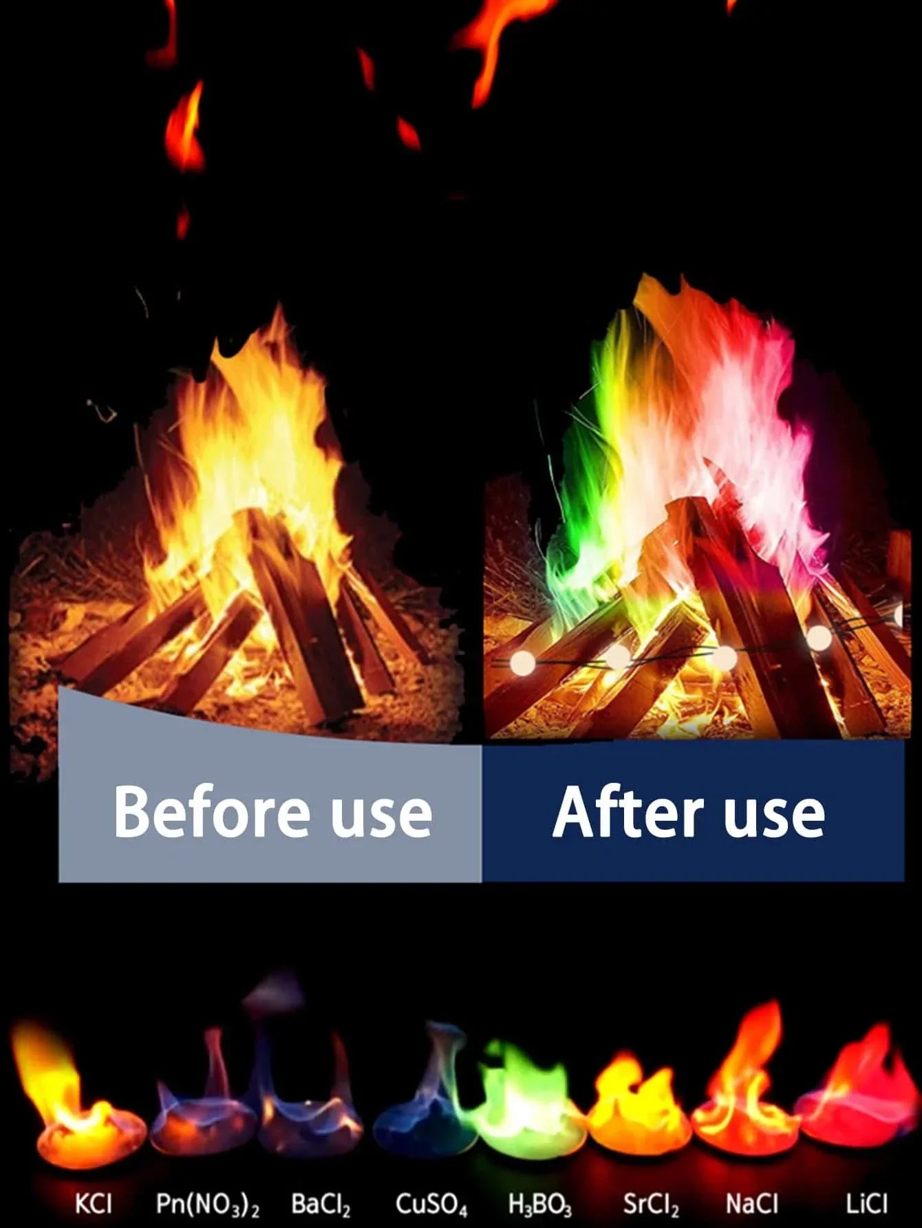 With our Magical Flame Color-Changing Fire Packets, transform any fire into a mesmerizing display of vibrant colors. These packets are perfect for camping trips, bonfires, and indoor fireplaces, instantly enhancing your fire experience. Here's why they're a must-have: