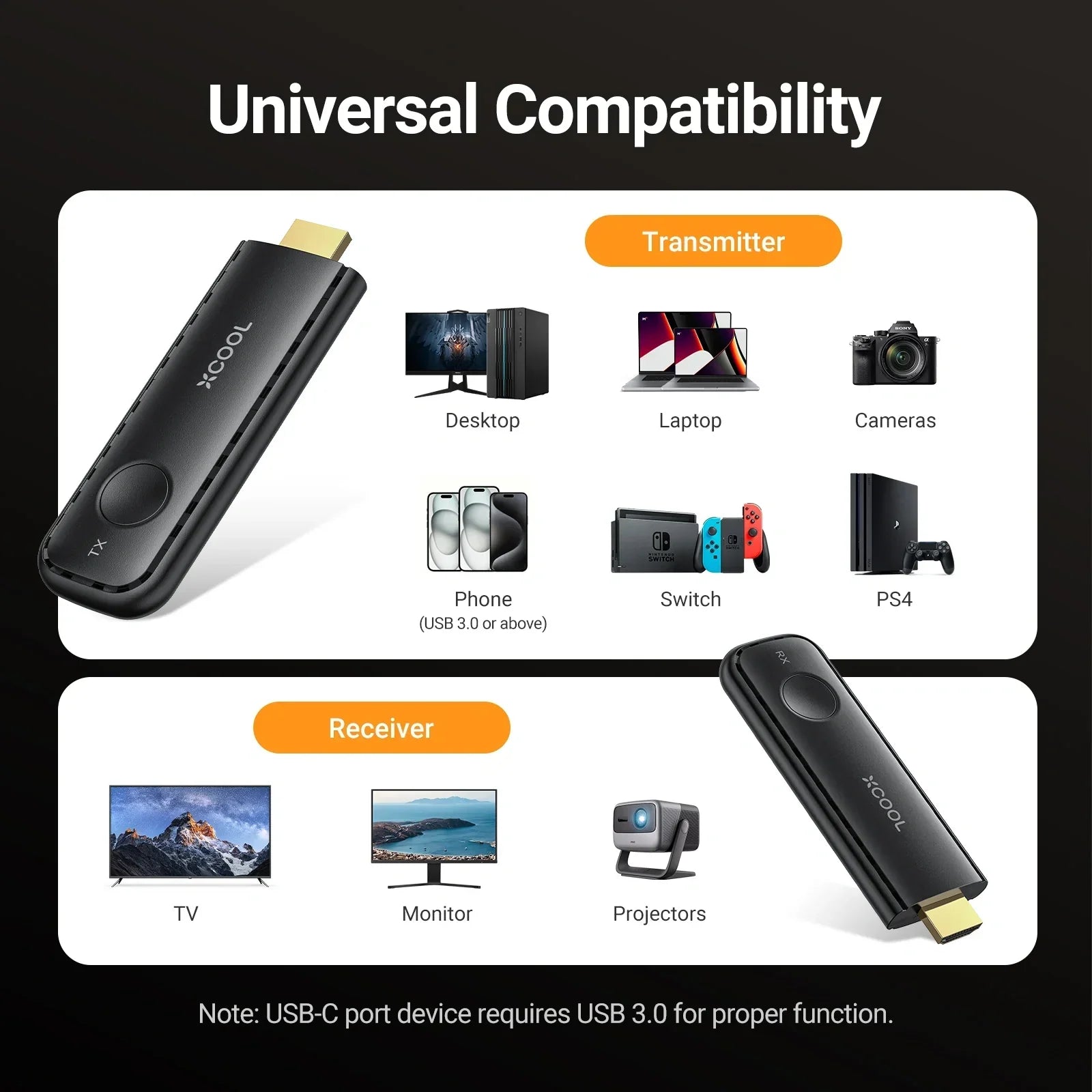 The wireless transmitter and receiver, casting device for TV/monitor, supports the transmission of high-definition video and audio for a crisp and clear viewing experience. Thanks to its plug-and-play design, setup is quick and easy, making it suitable for both home entertainment and professional presentations. The compact size and strong signal range offer flexibility so you can enjoy seamless connectivity anywhere in the room.
