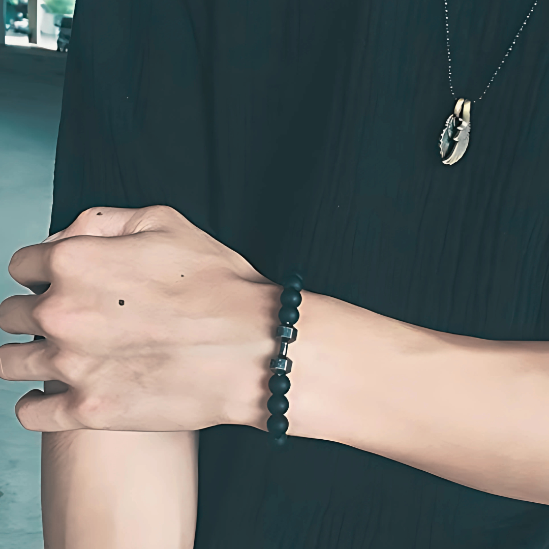 IronBrace™ brings a new edge to your style. Combining the rugged appeal of natural stone with a striking dumbbell accent, it’s the perfect accessory for fitness enthusiasts who value both style and strength.