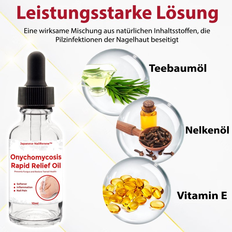 Japanese NailRenew™ Onychomycosis Quick-Relief Oil is specifically designed to kill toenail fungus and treat severe fungal infections of the nails, it prevents recurrence and spreading of the fungus to other nails. It uproots deep-seated bacteria and fungal spores with its powerful anti-inflammatory agents and bio-enzymes, relieving pain and inflammation and quickly healing thick toenails.