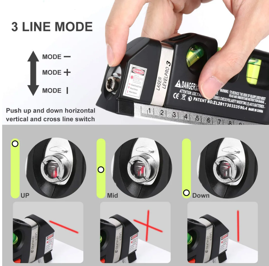 We present to you the ultimate solution for all your measuring needs – the Multifunction Laser Level. This innovative tool is a must-have for any DIY enthusiast, whether you're hanging shelves, cabinets, tiles, or picture frames. Say goodbye to crooked installations and inaccurate measurements; our laser level ensures precision and efficiency in every project. With the easy one-slider operation, you can effortlessly switch between vertical, horizontal, and cross laser line modes, making it suitable for a variety of tasks, including hanging pictures.
