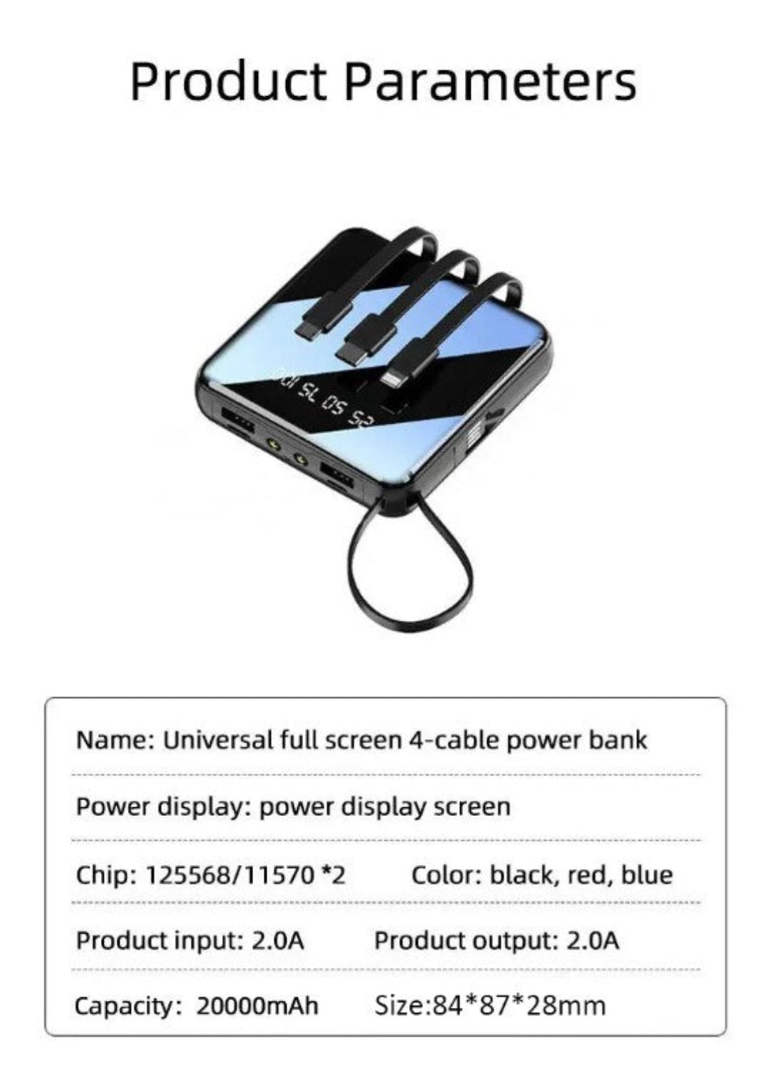 Enhance your mobile experience with the 4-Cable 20,000 Mini Power Bank, which guarantees uninterrupted power wherever you are, so you can enjoy every moment without worrying about battery life.