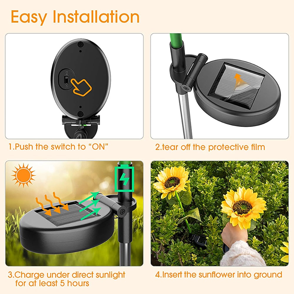 Our SolarSunflowerLights™ are the most unique decorative solar lights on the market, supported by very soft and flexible wires, so the light sways in the wind, and you will be amazed at how beautiful they are. The lights add a touch of luxury to your space. A fantastic addition to any outdoor area. Simply plant them in your garden and enjoy the most beautiful decorative solar lights in the world.