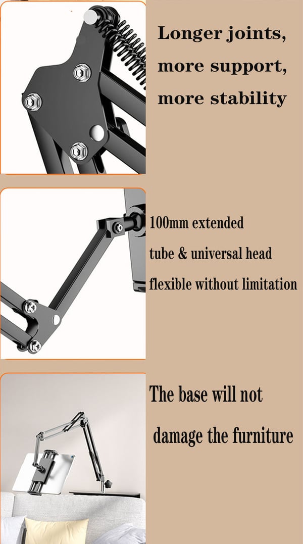 ✔️ Enhanced Comfort: With four adjustable joints, including three tension adjusters and a 360-degree rotating arm, our holder offers unparalleled comfort and flexibility. Whether you're standing, sitting, leaning, or lying down, you can easily position your device for optimal viewing without straining your neck or arms.